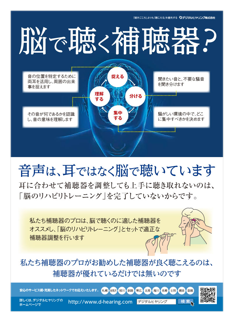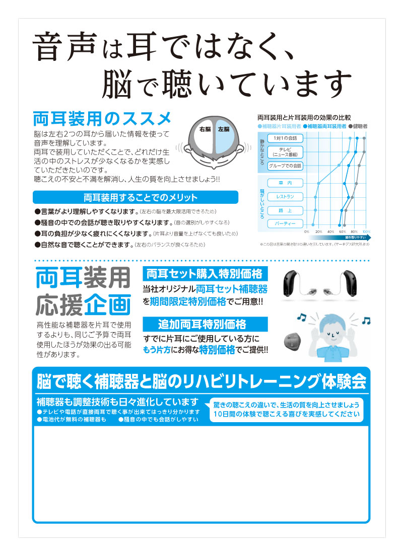 私たち補聴器のプロは、脳で聴くのに適した補聴器をオススメし、「脳のリハビリトレーニング」とセットで適正な補聴器調整を行います。